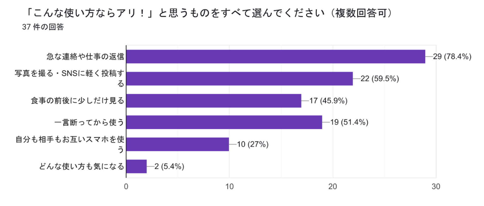 「食事中に許容される使い方」で最も多かったのは、「急な連絡や仕事の返信」。