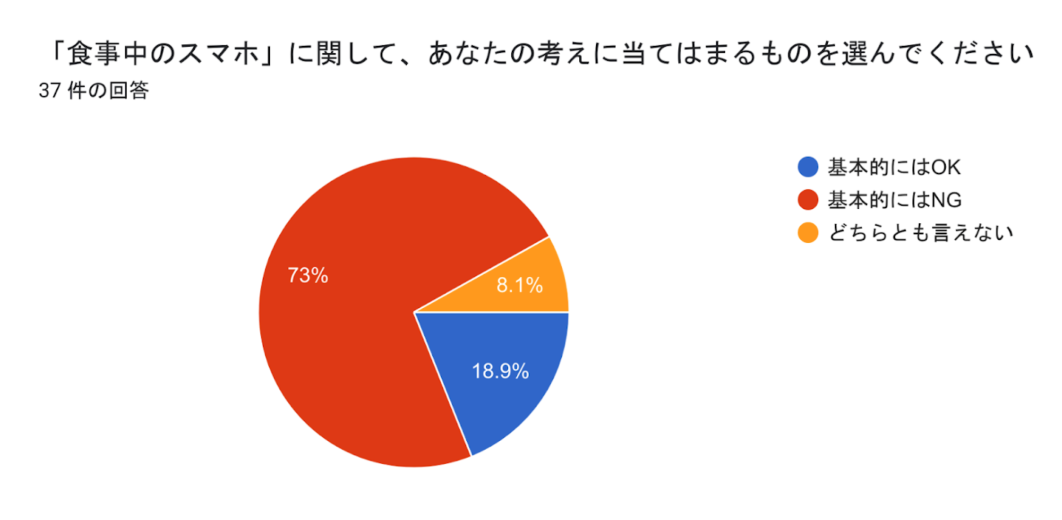 まず、「食事中のスマホ」に対する考えを尋ねたところ、7割以上の人が「基本的にはNG」と考えていることが分かりました。
