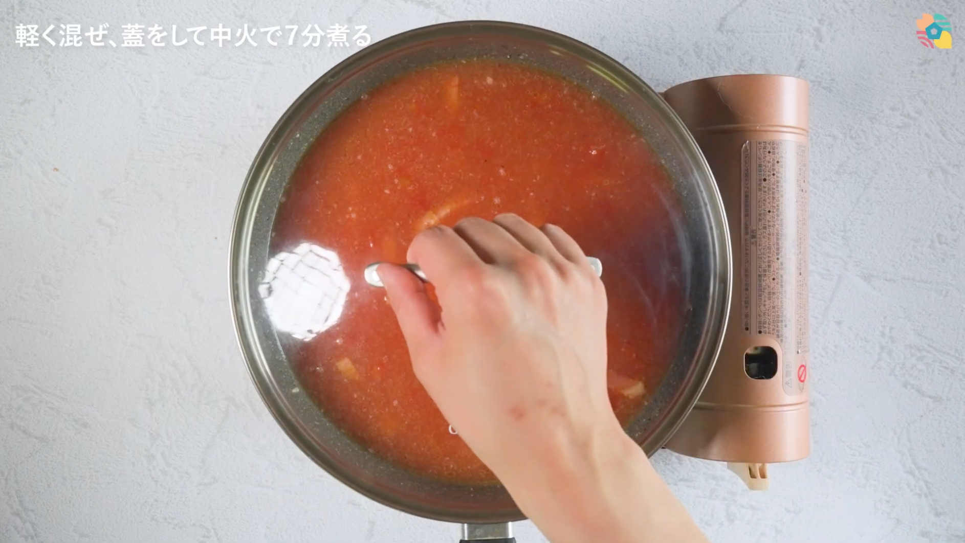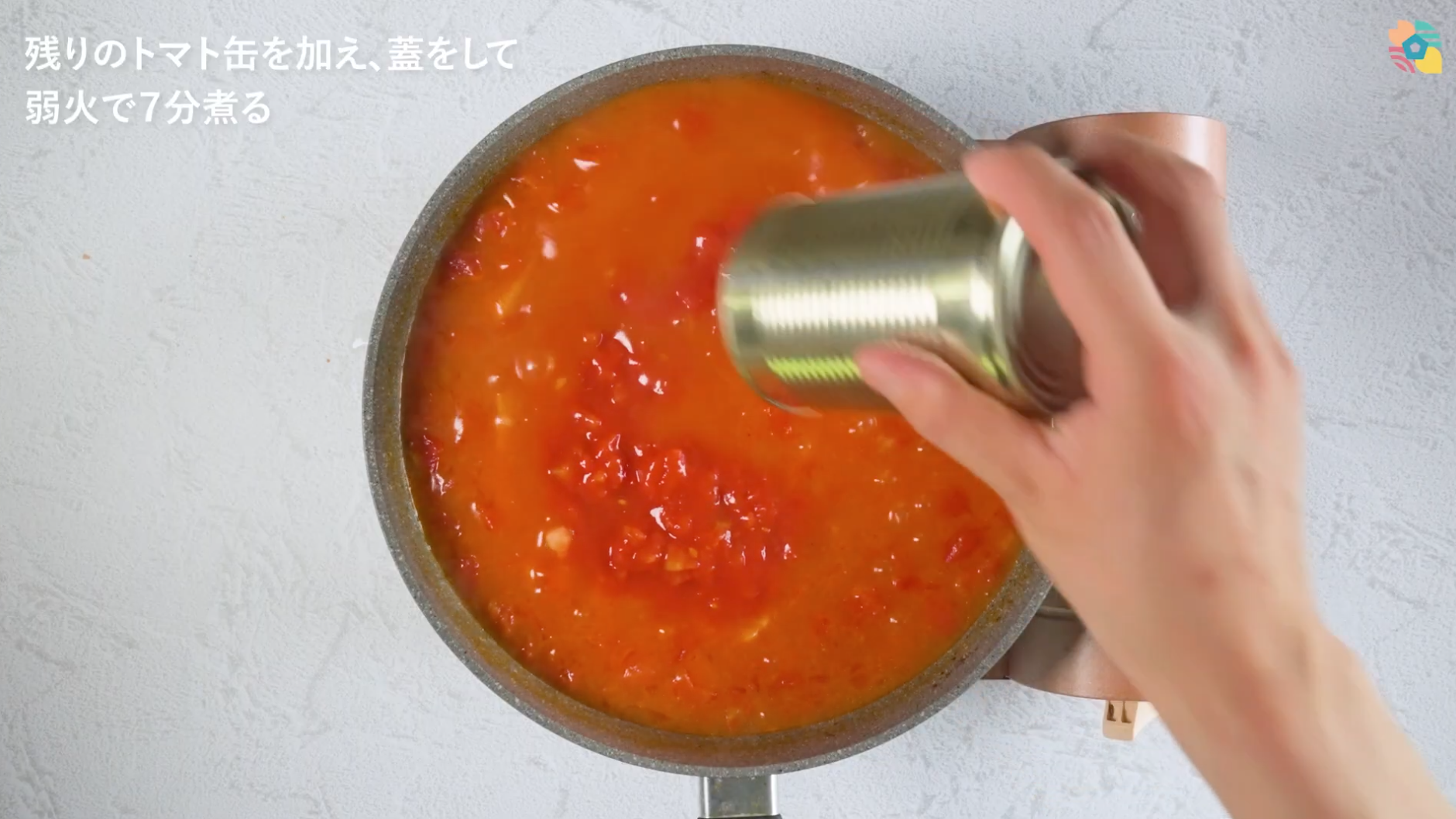 ④残りのトマト缶(約200g)を加え、再度フタをして弱火でさらに7分ほど煮込む。