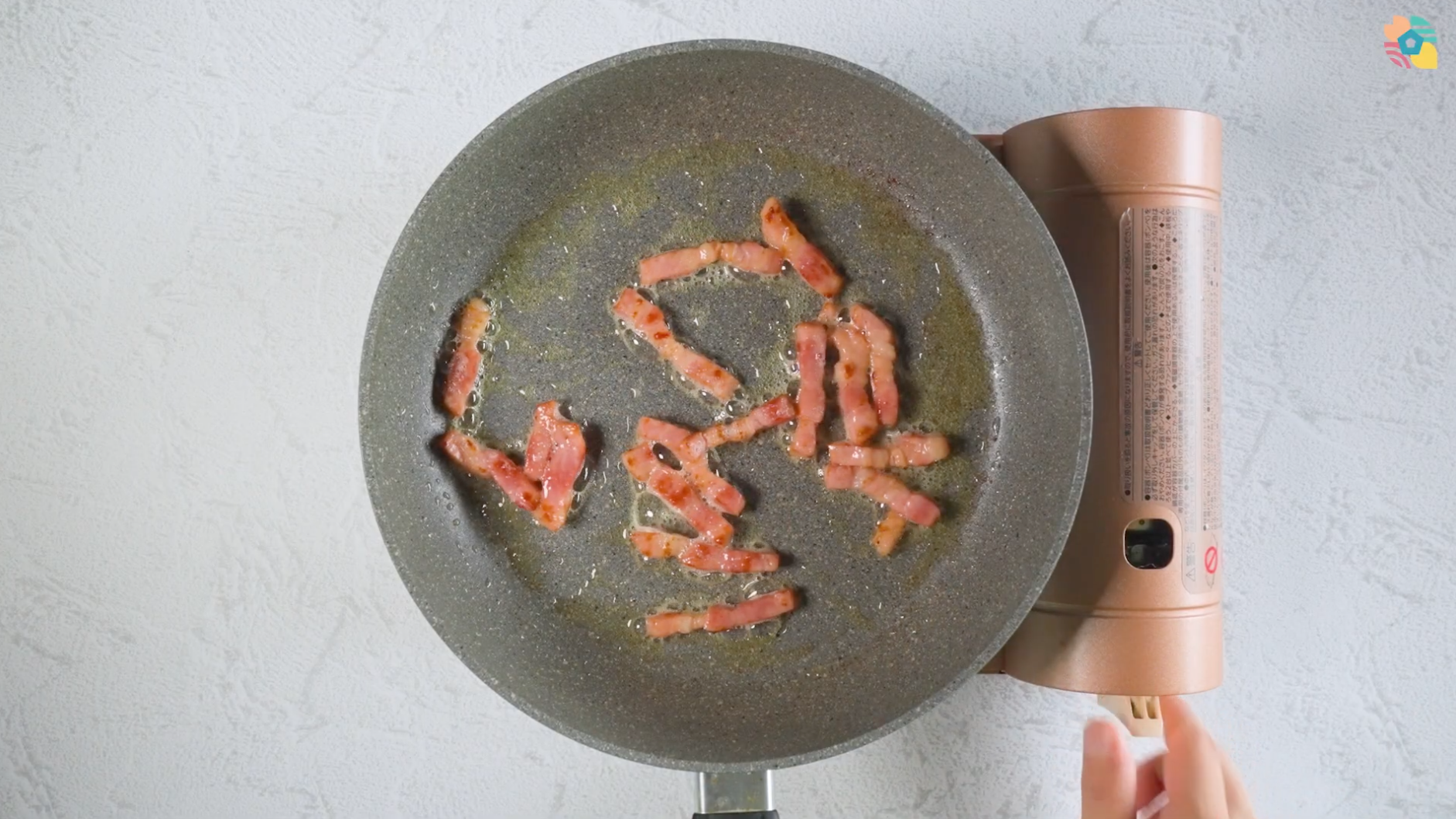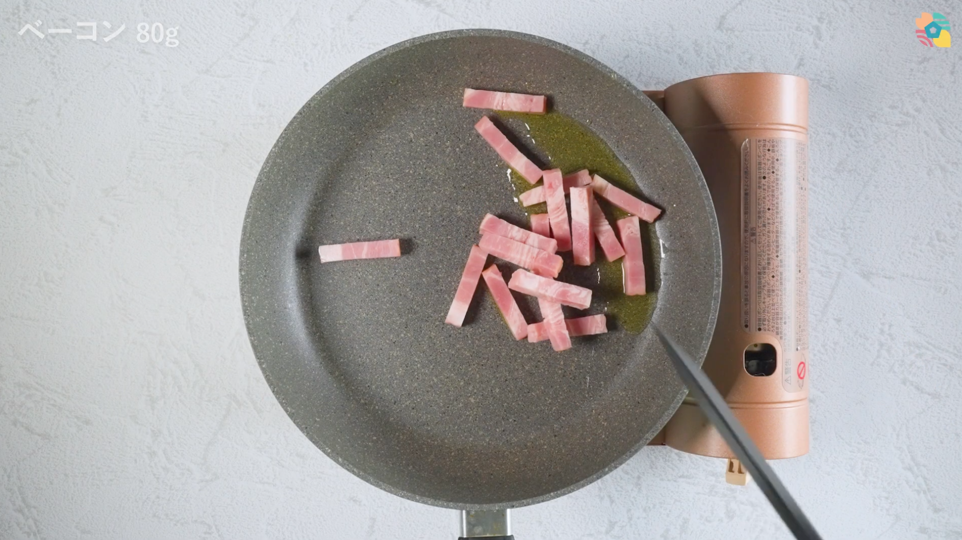 ①フライパンにオリーブオイルを引き、縦長にカットしたベーコンを加える。