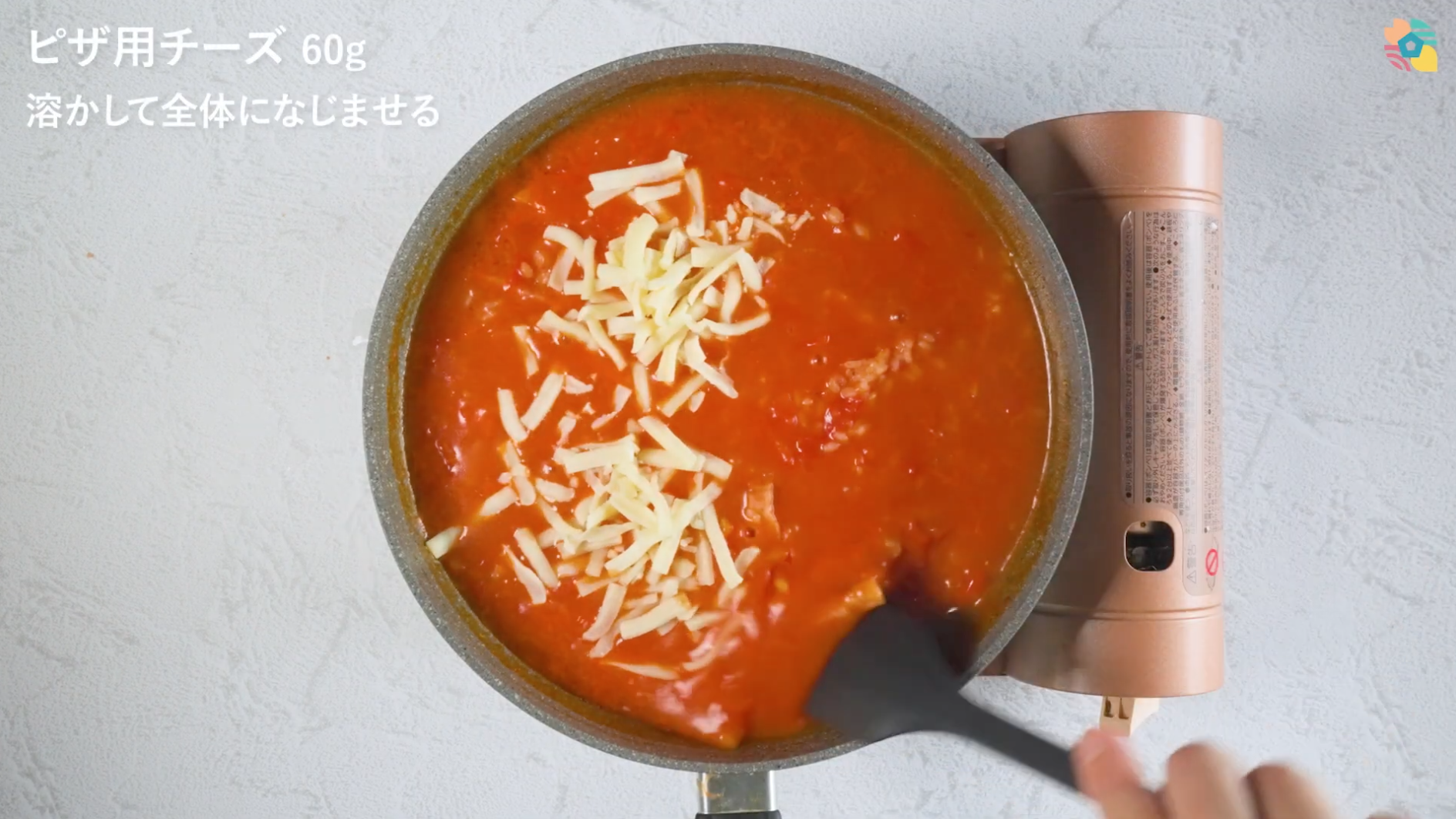 ⑤ピザ用チーズを加えてよく混ぜ、チーズがとろけて全体に絡んだら火を止める。