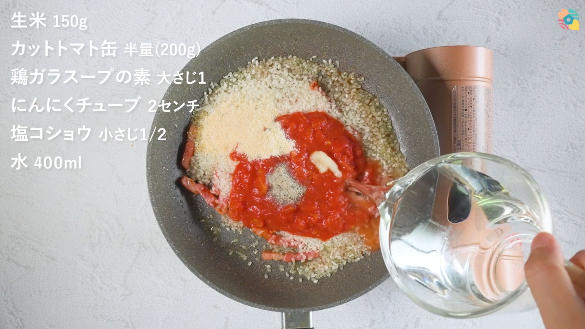 ②生米、トマト缶の半量(200g)、鶏ガラスープの素、にんにくチューブ、水、塩こしょうを加えて軽く混ぜる。