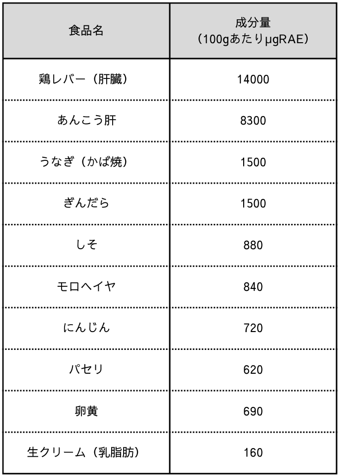 レチノールはレバー等の動物性食品に、βカロテンは緑黄色野菜に多く含まれます。