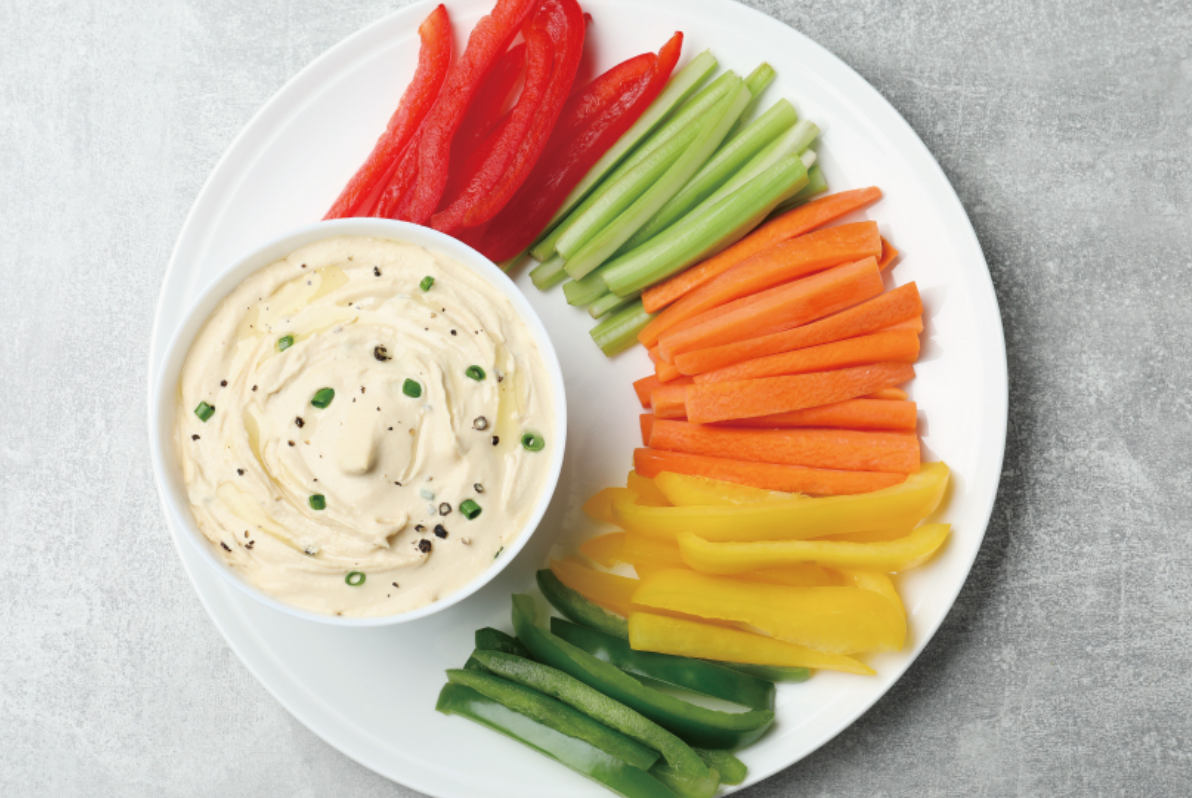 にんじん、きゅうり、セロリ、パプリカなどをスティック状にカットして、ひよこ豆のペースト「フムス」にディップ。