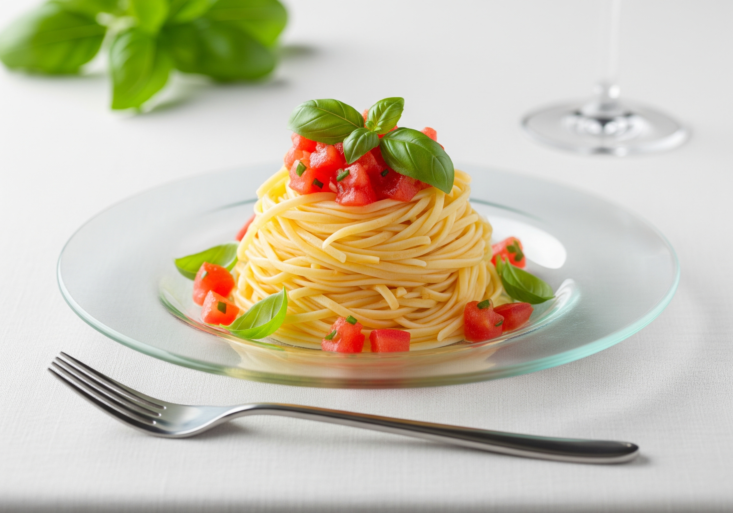 夏の定番、冷製パスをくるくるっとフォークで巻いてガラスのお皿にのせれば、一気にリストランテの雰囲気に。