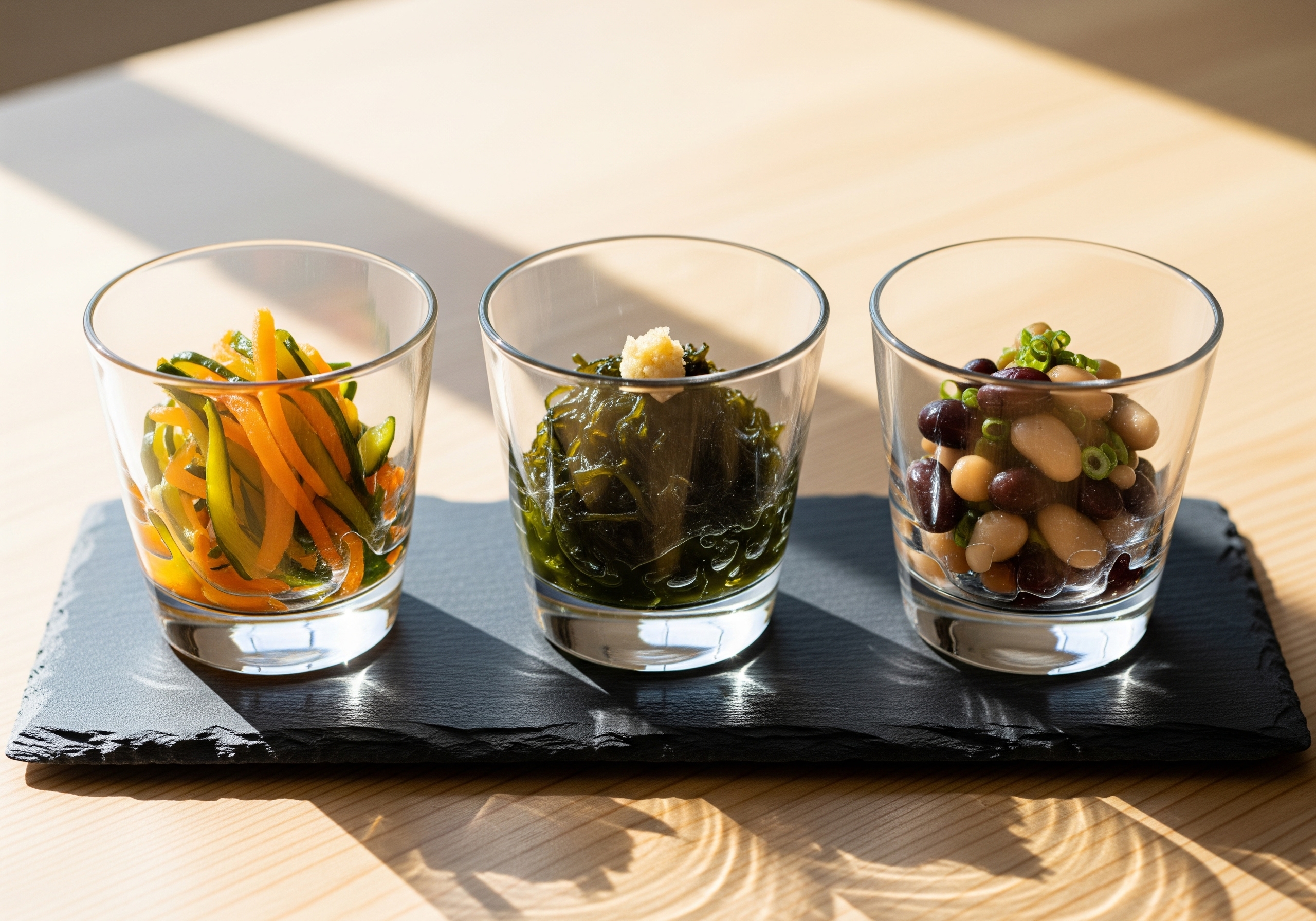 いつものもずく酢やピクルスも、小さなグラスによそうだけで、まるでおもてなしの一品に。