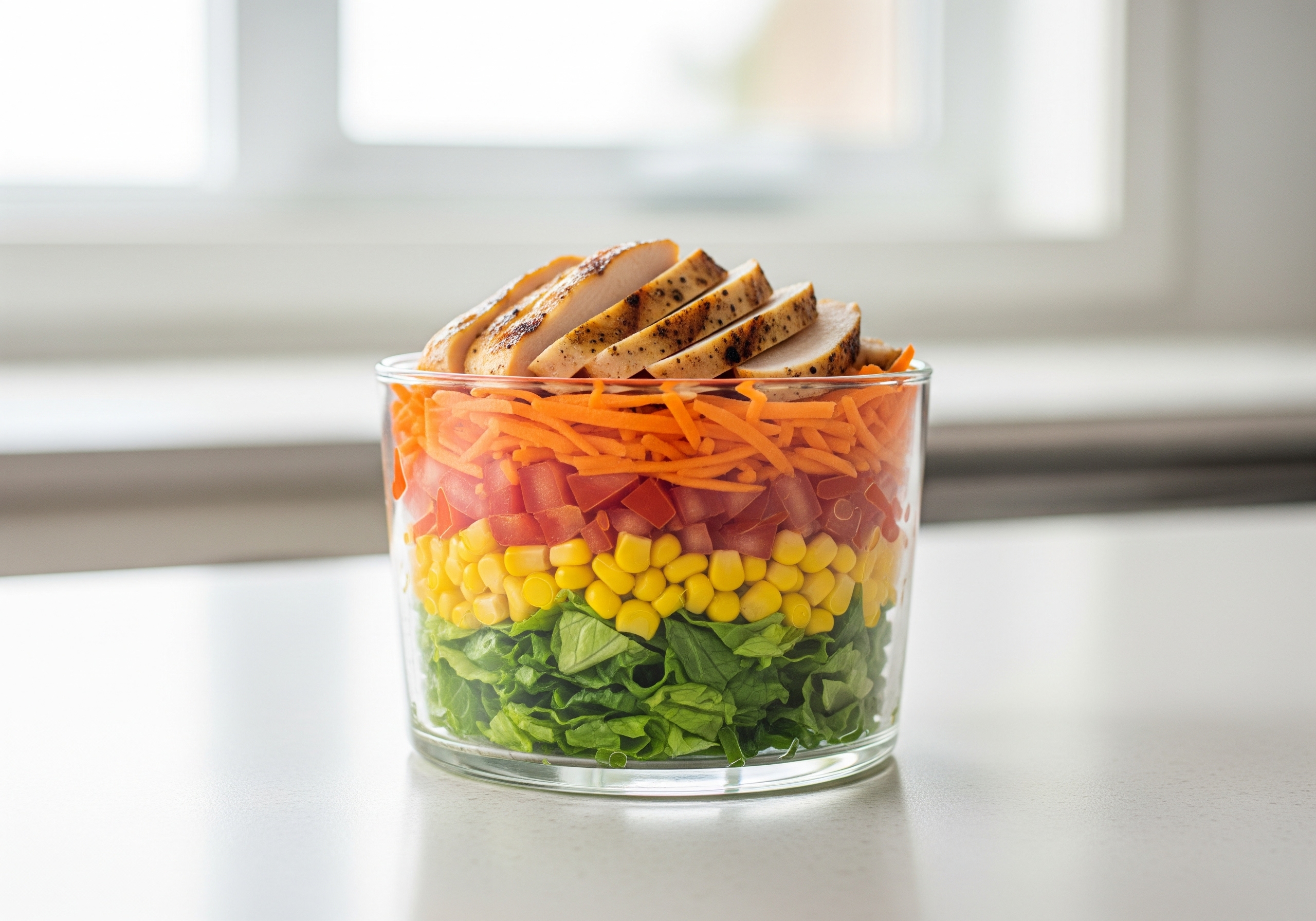 カラフルな野菜たちを、ただ混ぜるんじゃなくて、ふんわり層になるようにガラスのボウルに積んでみて。