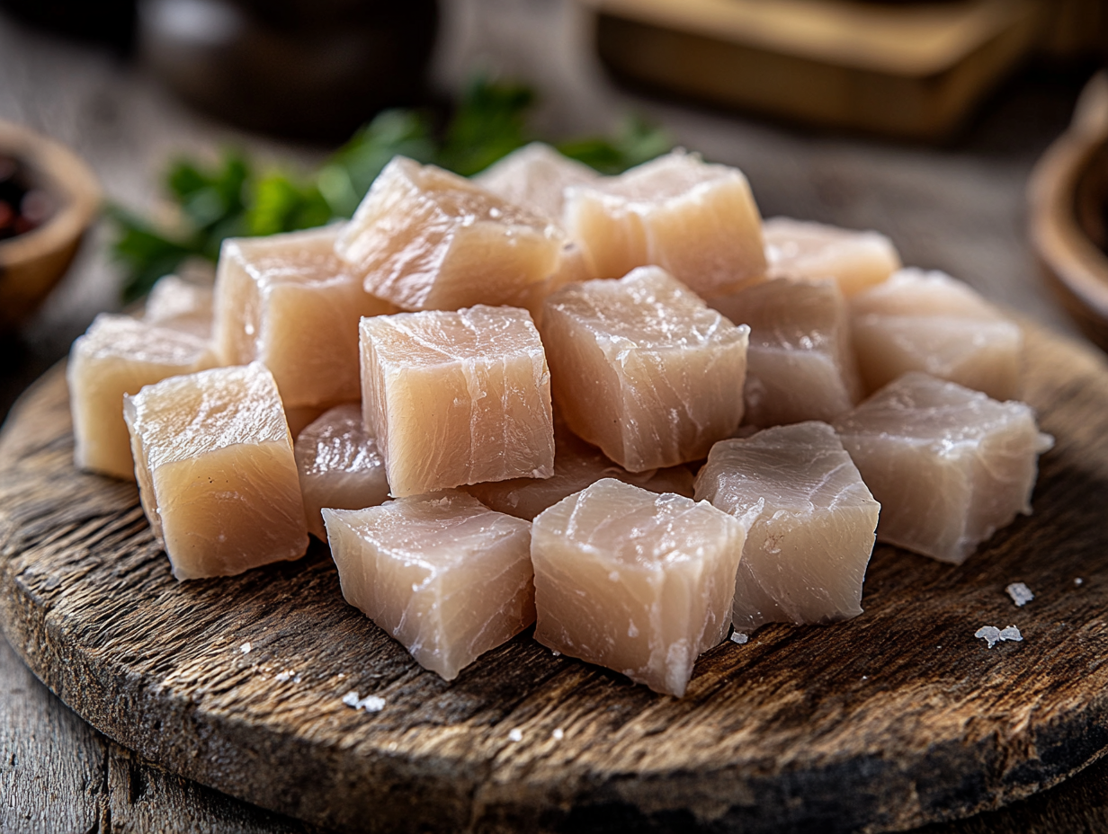 完成したハカールは、小さなキューブ状に切られて提供されます。