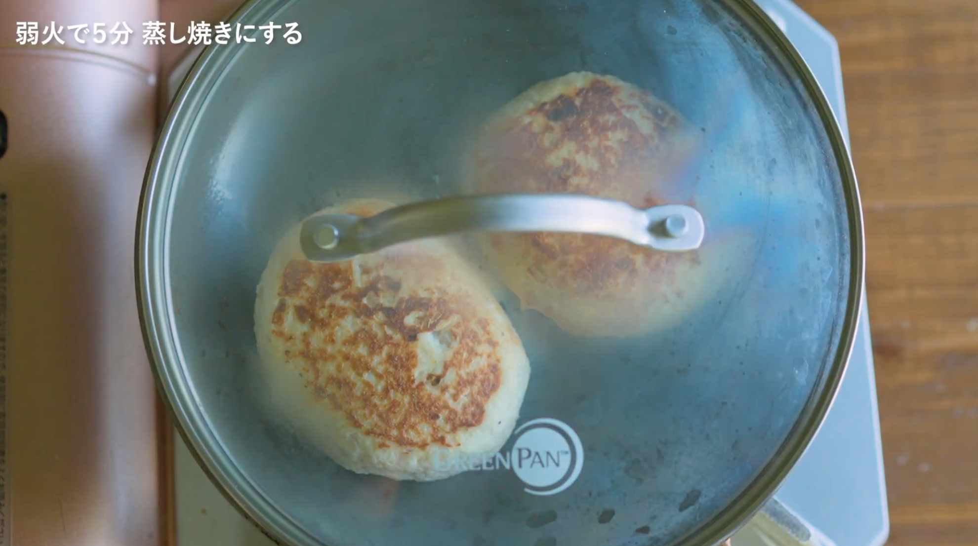 ⑤ 片面にしっかり焼き色がついたら、裏返して蓋をし、弱火で5分ほど蒸し焼きにします。