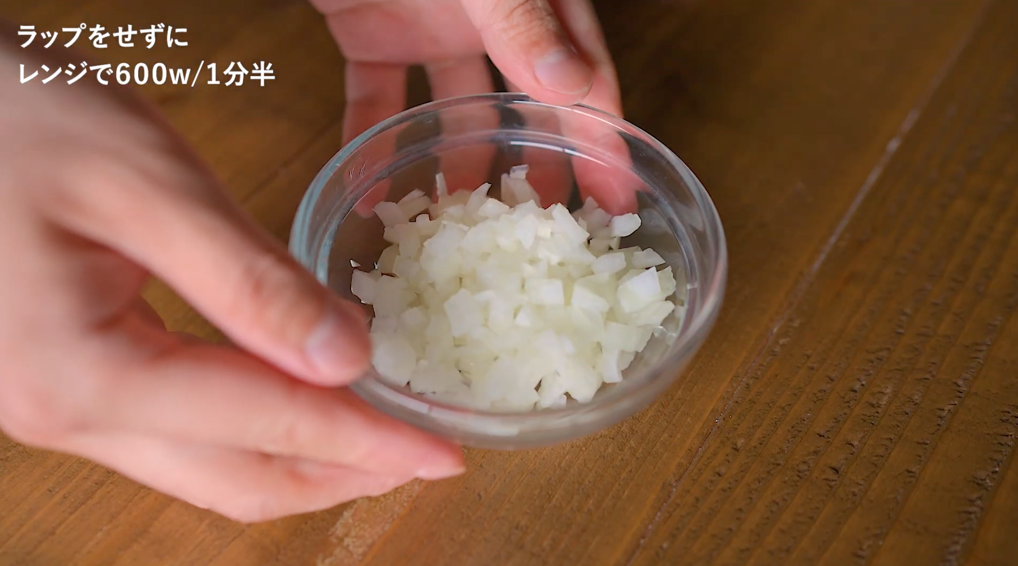 ① 玉ねぎをみじん切りにし、ラップをかけずに電子レンジ(600W)で1分半加熱します。