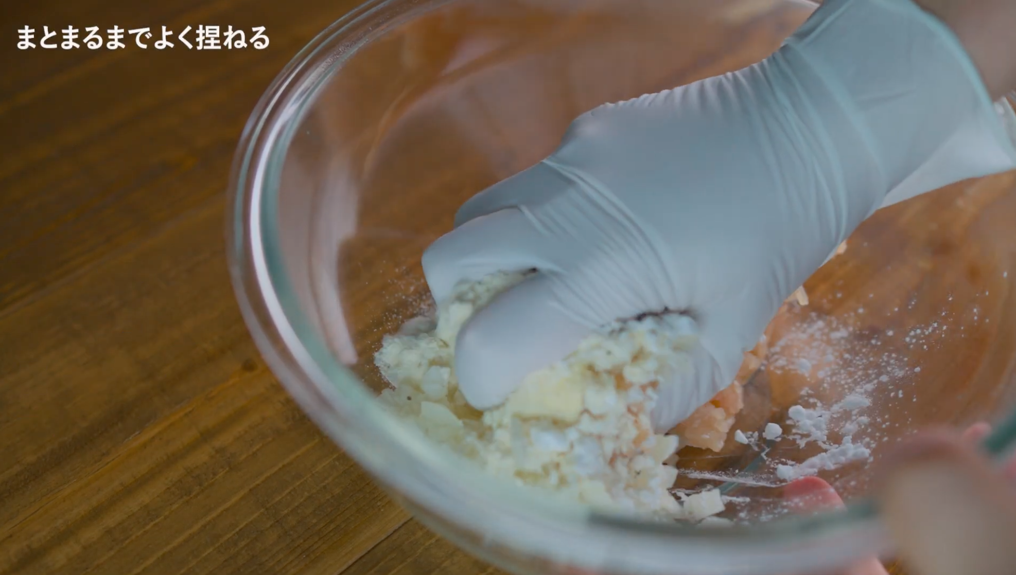 ③ 大きめのボウルに、①と②で加熱した玉ねぎと豆腐、☆を全て入れ、よく混ぜます。