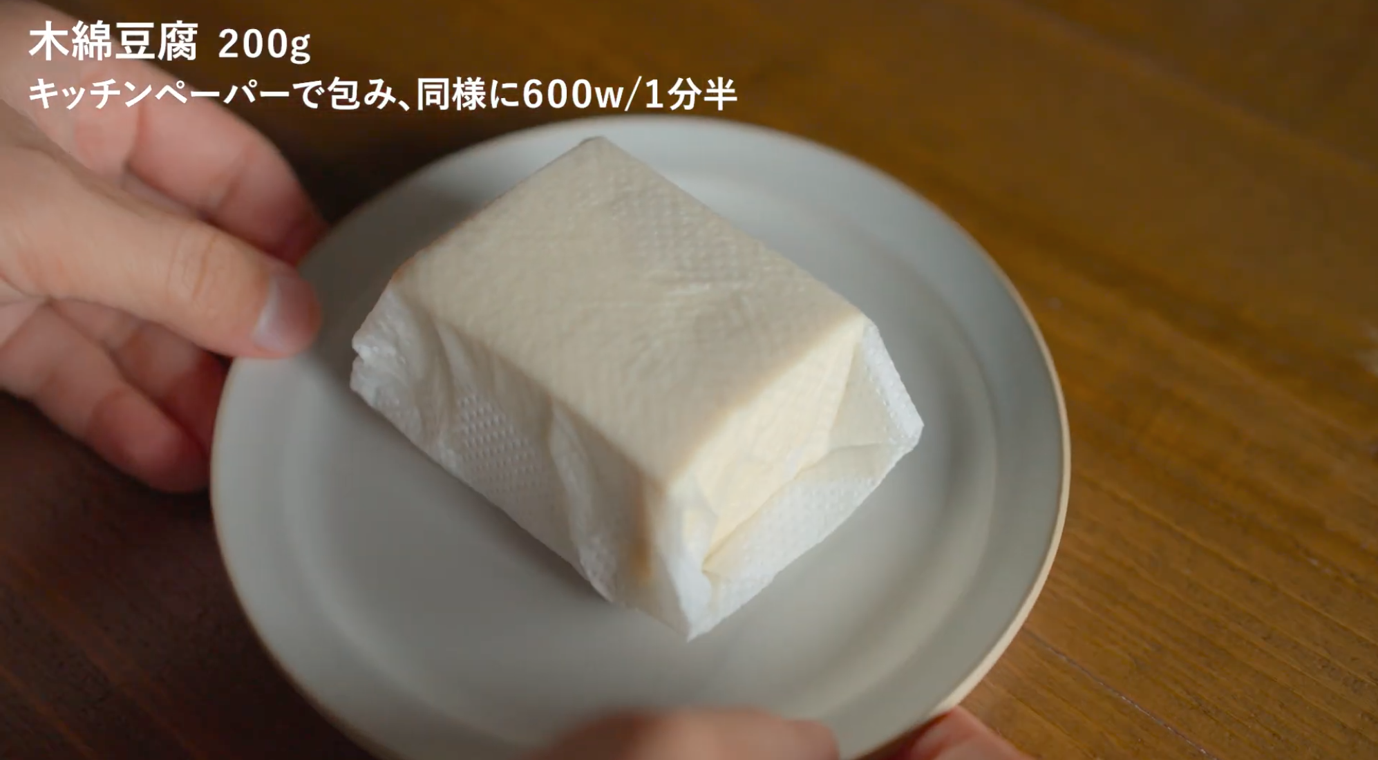 ② 木綿豆腐をキッチンペーパーに包み、同様に電子レンジ(600W)で1分半加熱します。