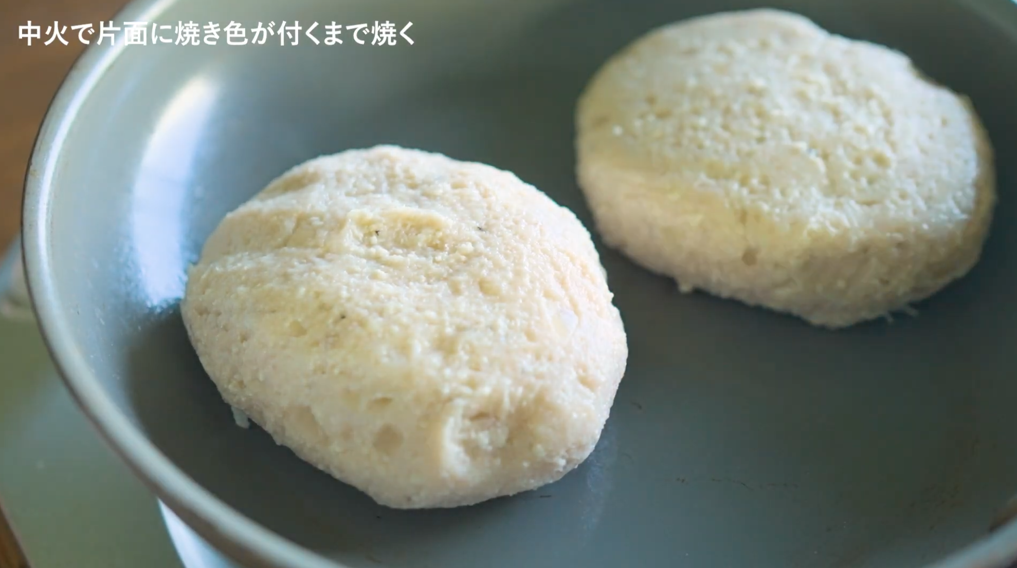 ④ ③でできたタネを小判形に形づくり、サラダ油を熱したフライパンで中火焼きします。