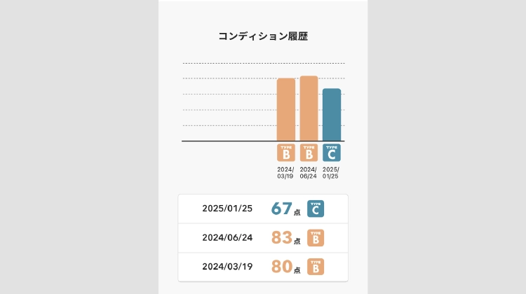 ただ、その後しばらく検査をしていなくて、最近久しぶりに試したらタイプがBからCに変わっていて驚きました。ちょうど体調不良だったので、それが影響しているかもしれません。スコアも下がっていたので、体調が万全なときにもう一度試してみようと思っています。
