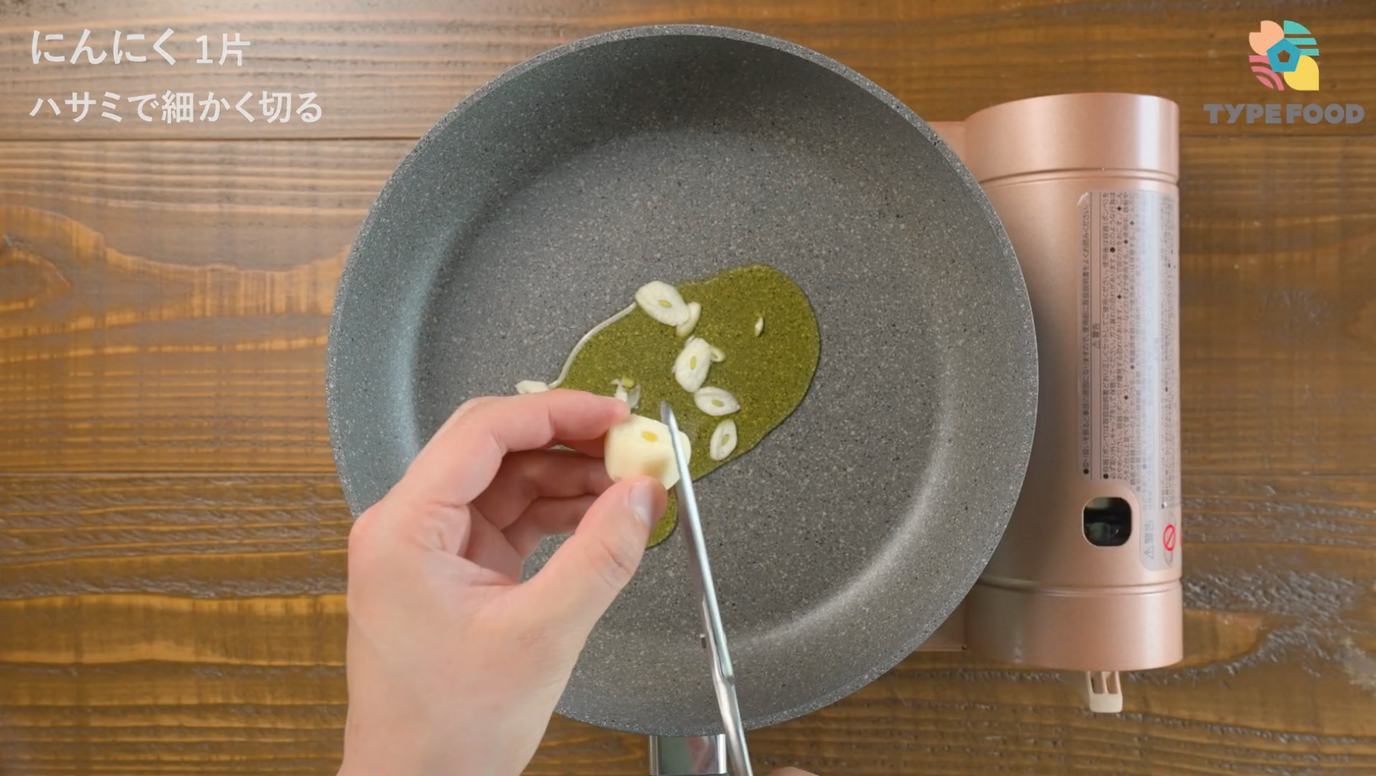 ①フライパンにオリーブオイルを入れ、にんにく1片をキッチンバサミで細かくカット。