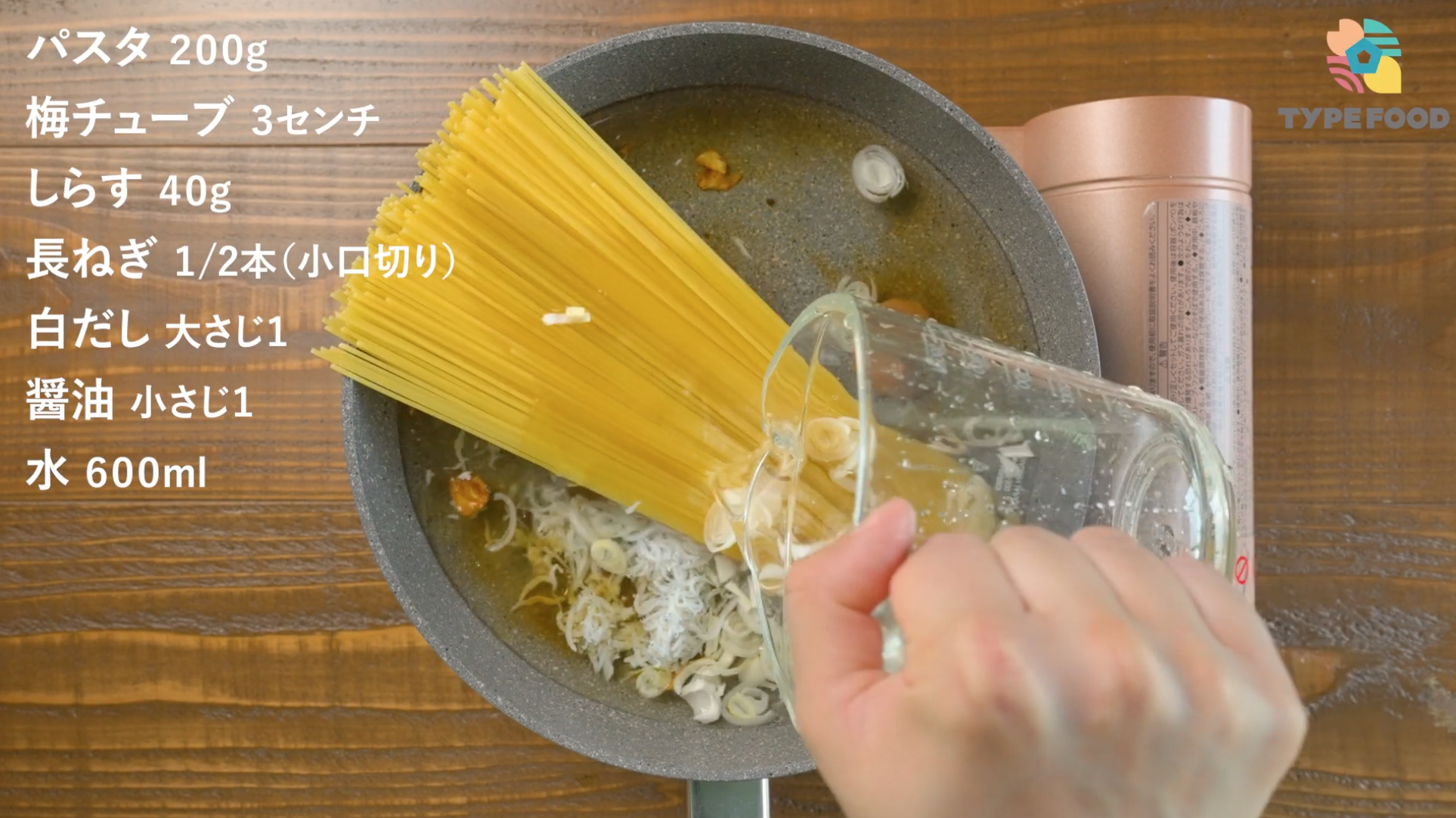 ③フライパンにパスタ、梅チューブ、しらす、長ねぎ(ハサミで小口切り)、白だし、醤油、水をすべて入れる。