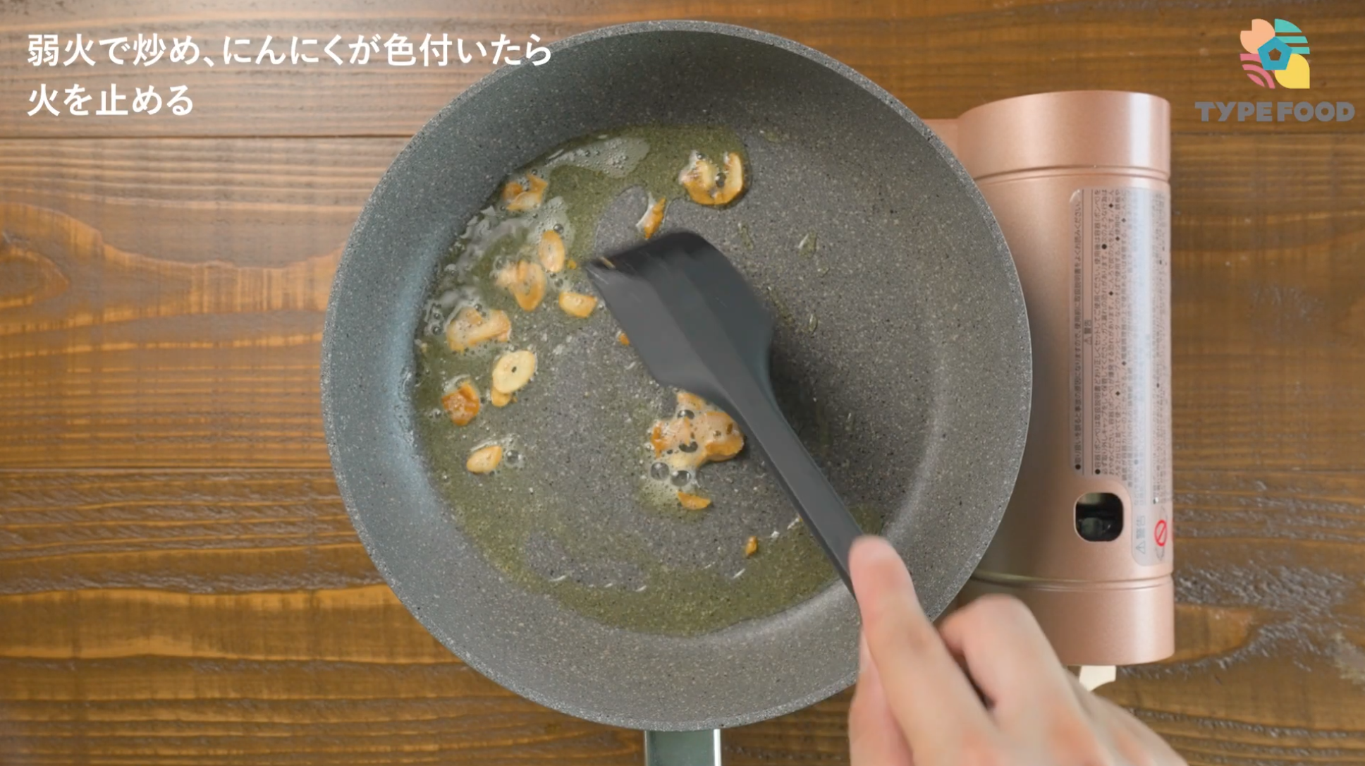 ②弱火でじっくり炒め、にんにくがほんのり色づいたら火を止める。