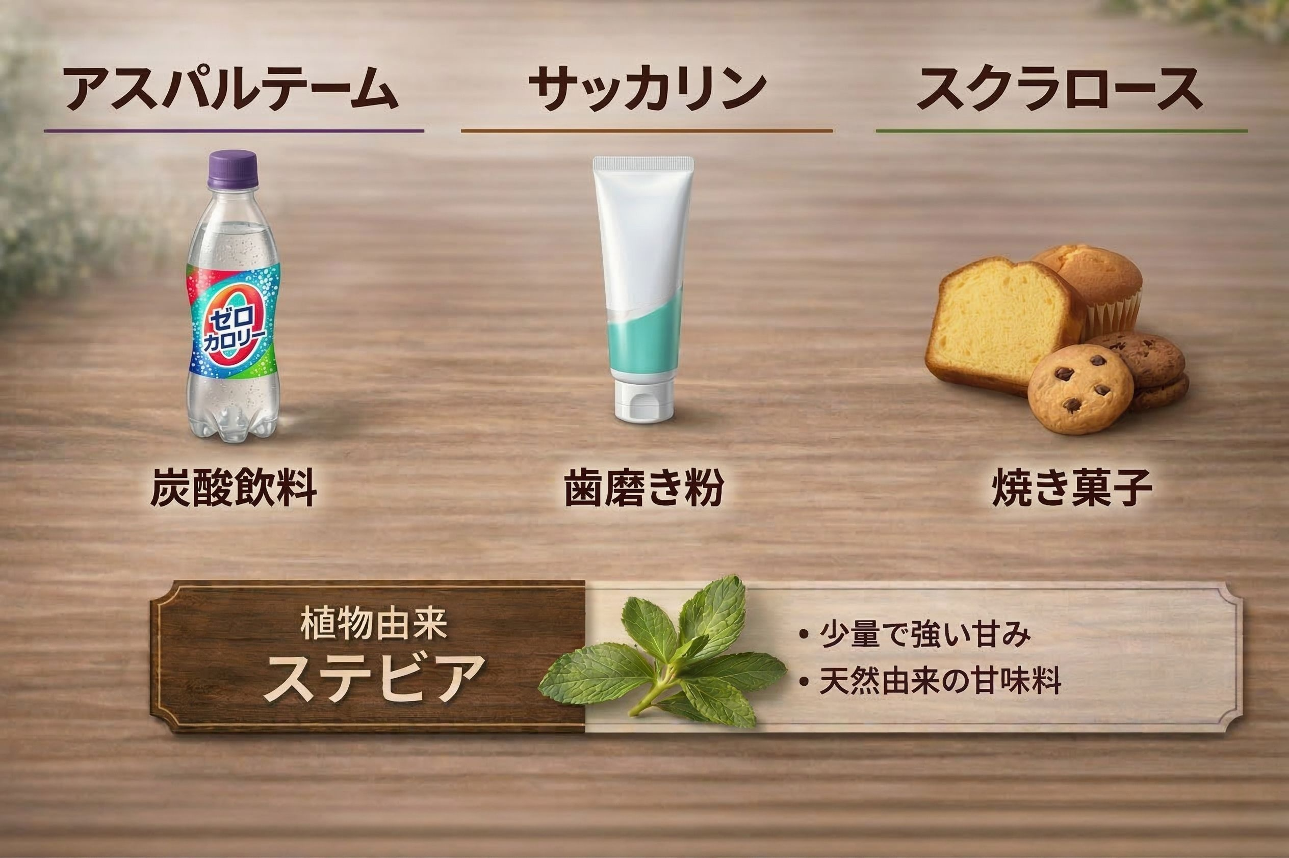 また、同じように少量で強い甘みを出せる「ステビア」という甘味料もあります。