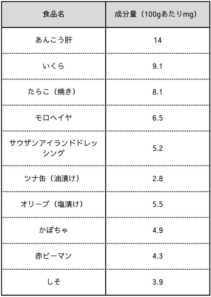 日本人の食事摂取基準(2020年度版)では、成人において5〜7mg/日摂取が目安とされています。