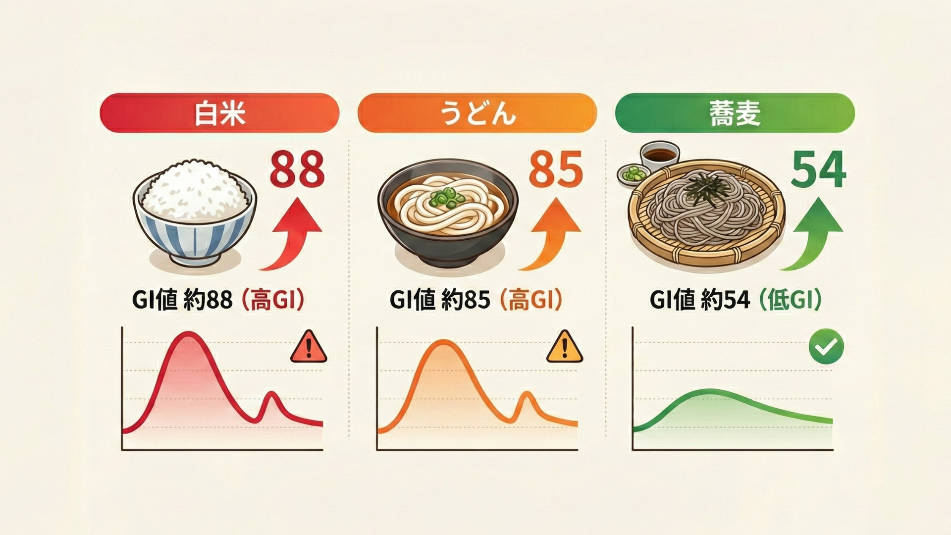 GI値とは、食後にどれだけ血糖値が上がりやすいかを示す数値のこと。 白米のGI値が約88、うどんが約85なのに対し、蕎麦は約54と大幅に低いのが特徴です。