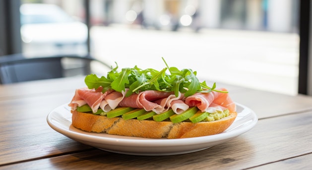 アボカドや生ハムを乗せたバゲットに、ルッコラをふんわり。
