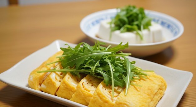 冷奴やだし巻き卵にルッコラをちょい足し。