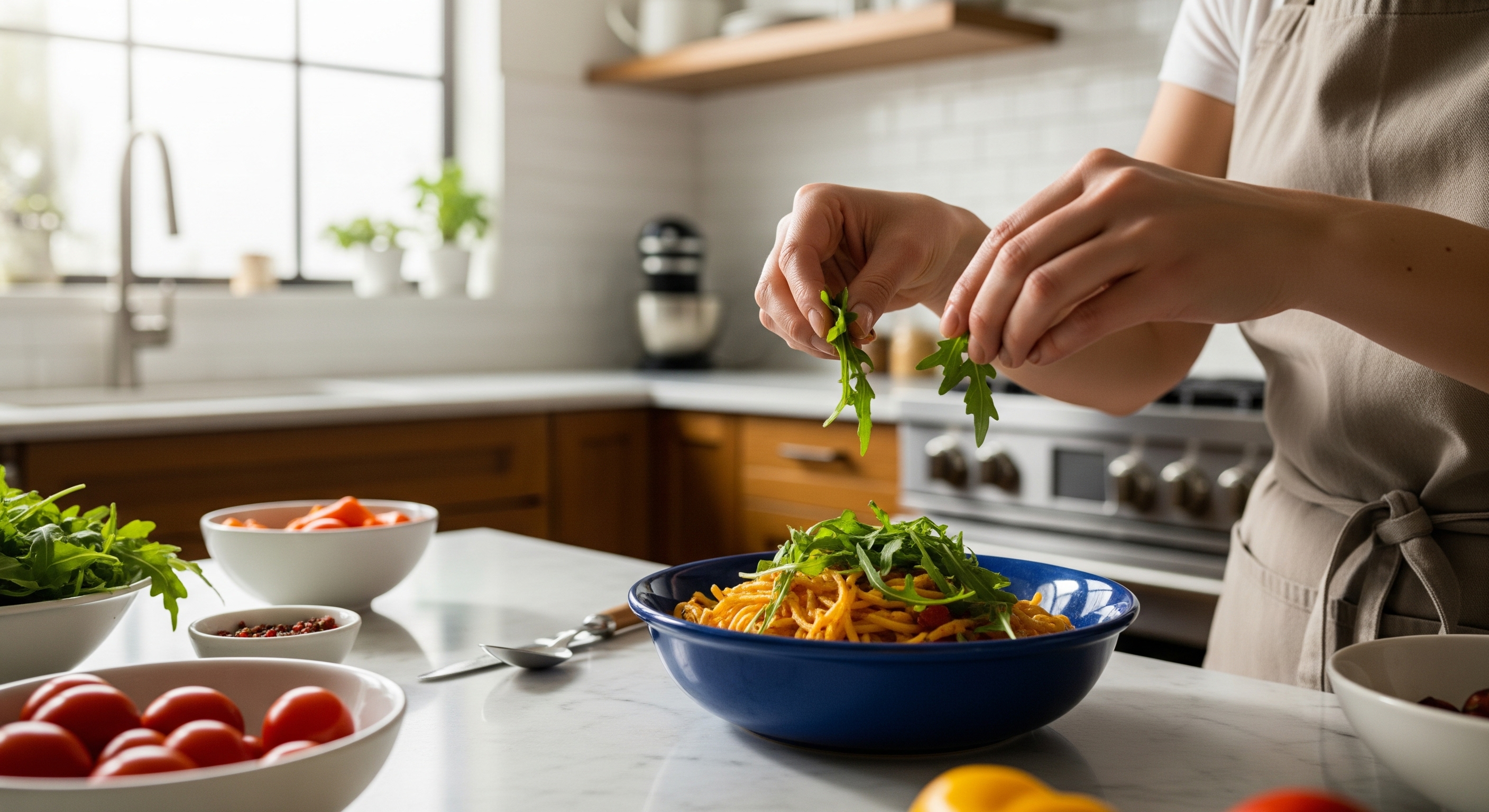 パスタの仕上げにルッコラをのせるだけで、雰囲気が一気におしゃれに。
