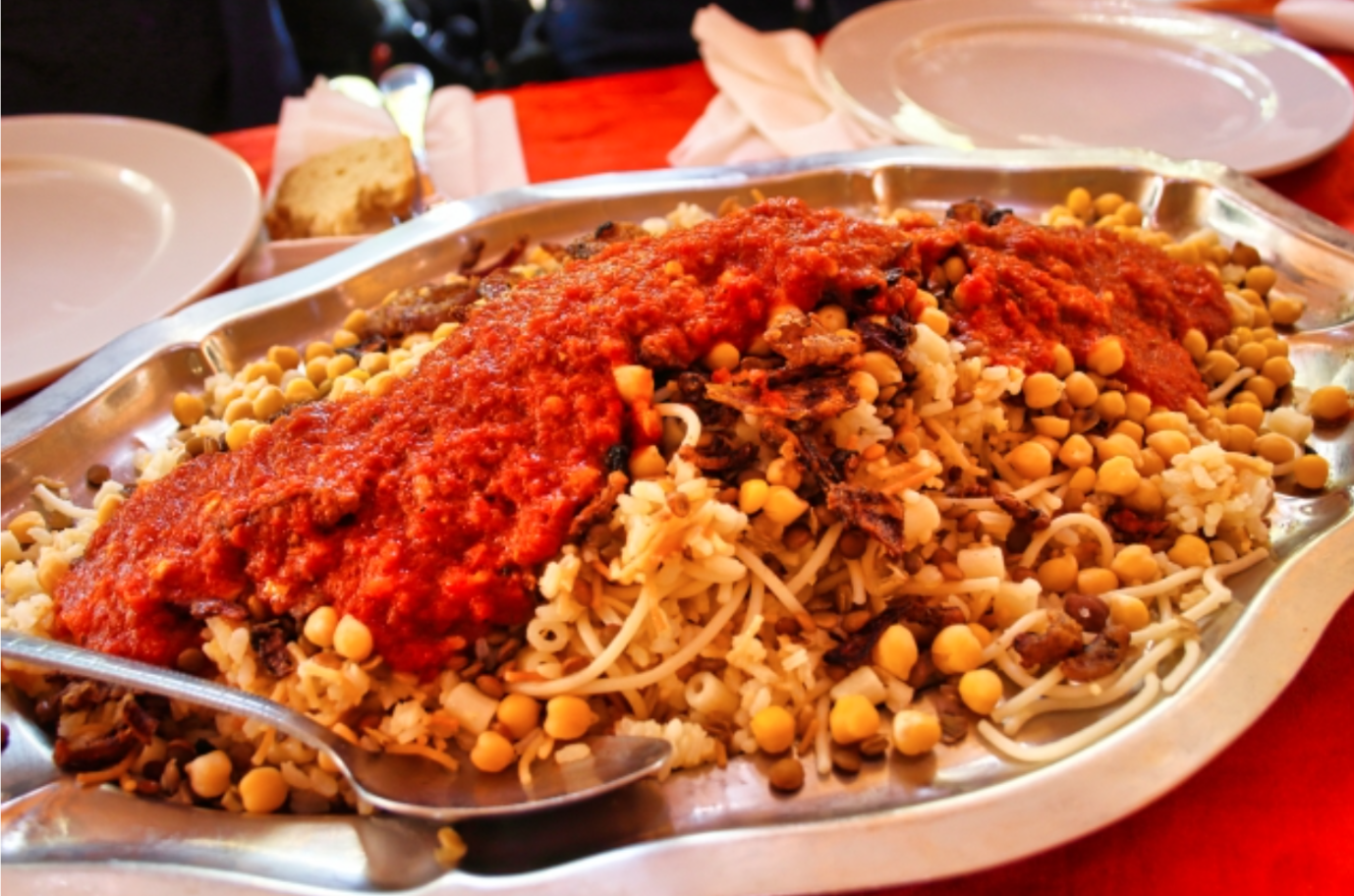 コシャリはご飯、レンズ豆、ひよこ豆に加え、マカロニやスパゲッティを混ぜ合わせ、トマトソースをかけていただく料理。